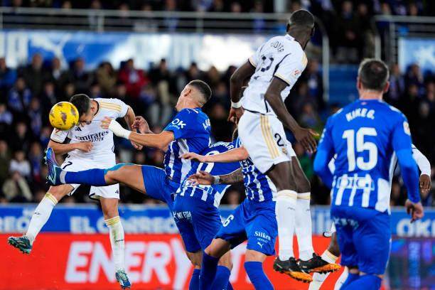 纳乔和吕迪格的配合生疏勉强,尤其左右边后卫分别是弗兰·加西亚和卢卡斯·巴斯克斯,都是攻强于守,因此即便对面是阿拉维斯这种级别的对手,依然出现一些险情。要知道,就在上一轮,直接竞争对手赫罗纳3比0完胜阿拉维斯,在机会均等的情形下靠技术击倒对手。而皇马在比赛中没有非常明显的优势,纳乔被罚下前,也只有巴尔韦德的2脚射门让门将做出扑救。反而是少一人作战后,皇马利用对手前压进攻的空当,让罗德里戈获得一次单骑闯关机会,弧线球稍稍偏出一点。